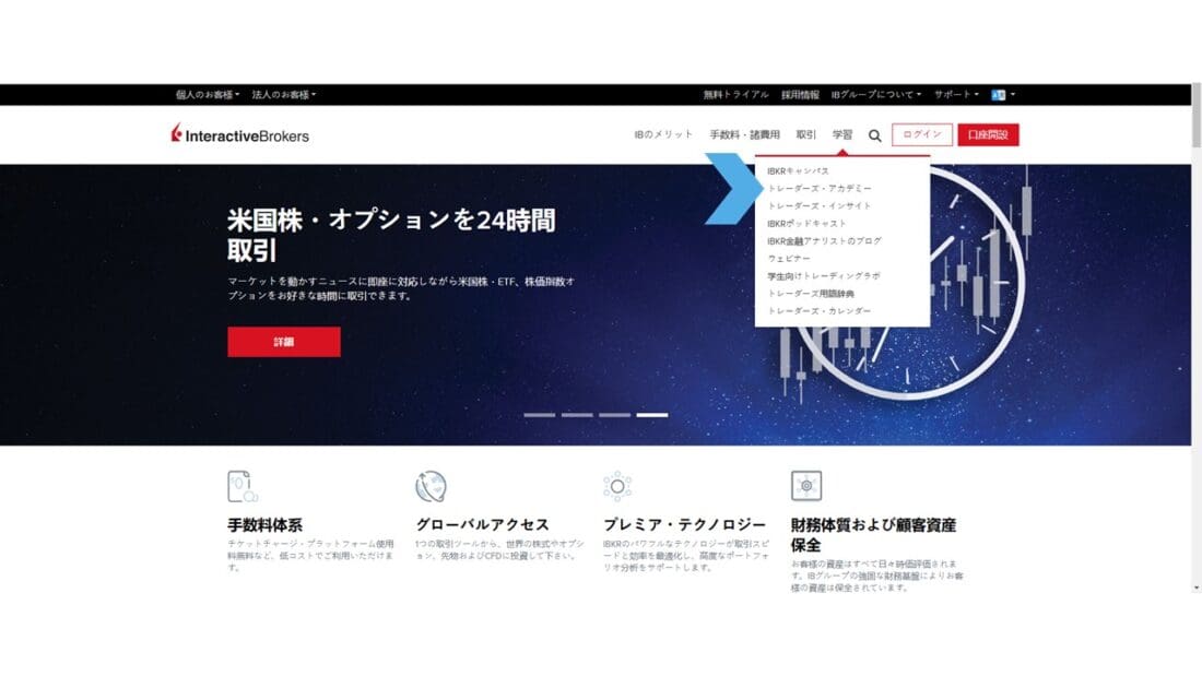 また、学習の項目にあるトレーダーズ・アカデミーからは、ウェブサイトで利用可能な無料のビデオチュートリアルを通じて、当社の取引ツールやその他のツール、サービスの利用方法を学べることにもご注目ください。