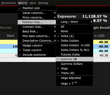 I recommend adding in the following position risk columns: Delta, Delta Dollars, Gamma, Vega, and Theta if they are not already selected. You are now displaying market prices and associated values.