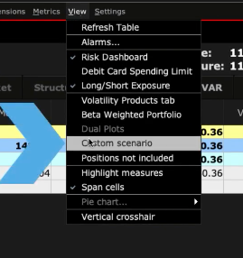 We will now bring up the custom scenario by going to the view menu at the top of the screen and scrolling down to custom scenario. This will replicate the market scenario with a custom scenario on the right of the screen.