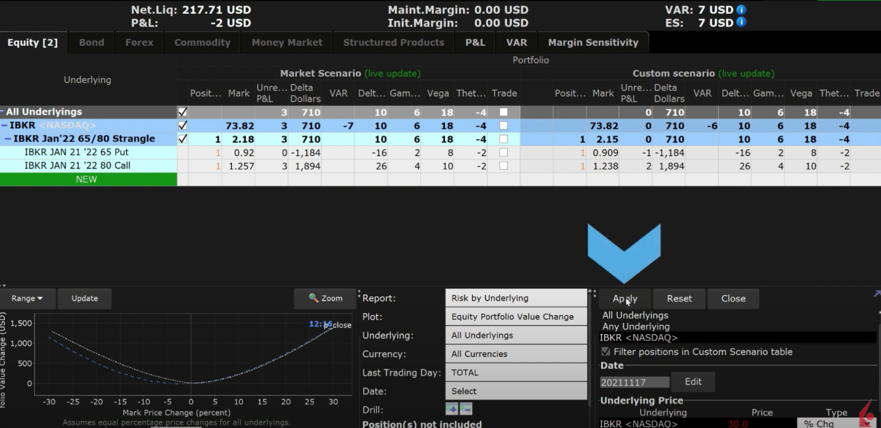 The TWS Risk Navigator is a powerful tool and can be used to calculate the likely forward price of single options and option combinations. In this video we will go through how to use the Risk Navigator what-if custom scenario feature to make assumptions on the forward price of an underlying and implied volatility to measure the potential price of an option and combination on various days leading up to expiration.