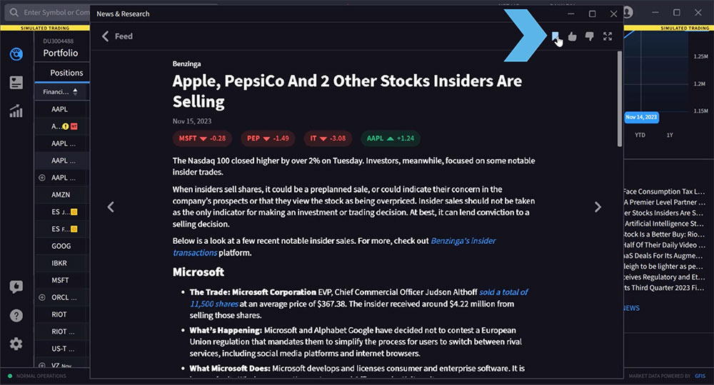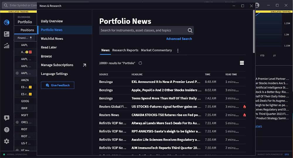 IBKR Desktop dispone de una amplia selección de noticias e investigaciones avanzadas, sobre el mercado y específicas de las empresas. La herramienta de noticias e investigaciones se puede configurar una vez abierta. Para acceder a ella, el usuario debe entrar primero a través de un mosaico de noticias en el panel de la derecha.