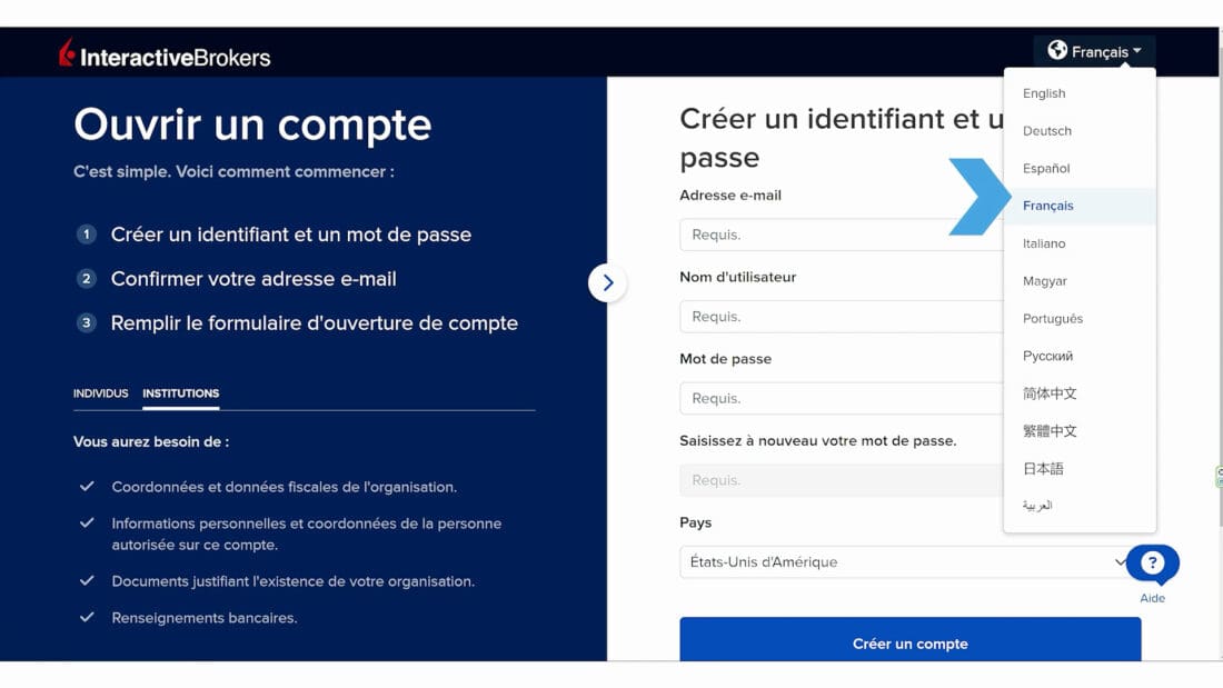 Sur notre site, vous pourrez trouver les exigences générales pour les clients individuels et institutionnels, les coordonnées de contact, ainsi que les coordonnées bancaires, et d’autres éléments spécifiques au type de compte demandé. Vous pouvez même choisir une autre langue pour remplir votre demande, si nécessaire. Une assistance supplémentaire est également disponible par le biais de nos services d’Aide.