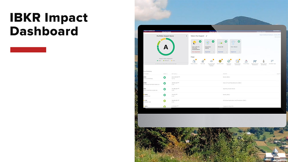 Speaking of ESG, use our Impact Dashboard – available in TWS, IBKR Mobile, Client Portal, and via APIs — to help ensure that your current and future investments reflect your values. For example, you can identify those values that are important to you like clean air and racial equality, and tag the practices that you find objectionable, like animal testing and greenhouse gas emissions.