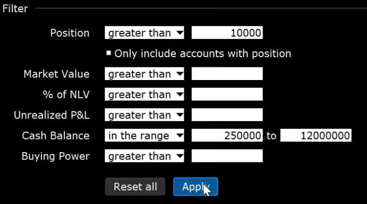Our final example is allocating to accounts with a position greater than 10,000 shares and a cash balance between $250K and $12mm.