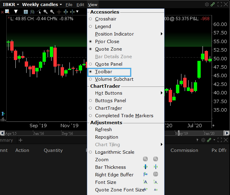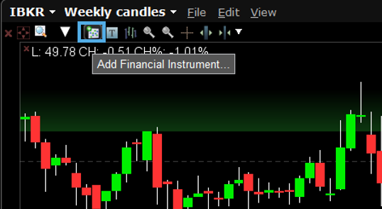 TWS also has a long list of technical studies. Use the Add Study icon to quickly apply them from the chart’s Toolbar. Let’s add the study icon to the toolbar if it’s not already visible.