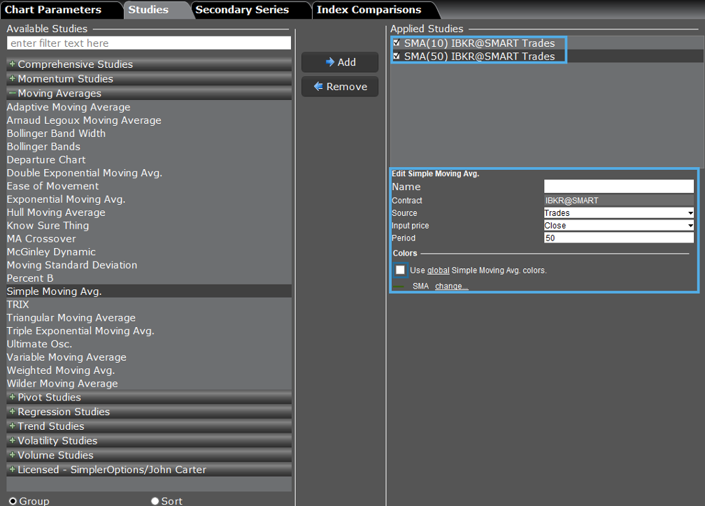 While the Studies tab follows the same category format, you can easily scour for all available fields using the search dialogue box. For example, I’ll type the word simple to narrow down all selections to find the Simple Moving Average.