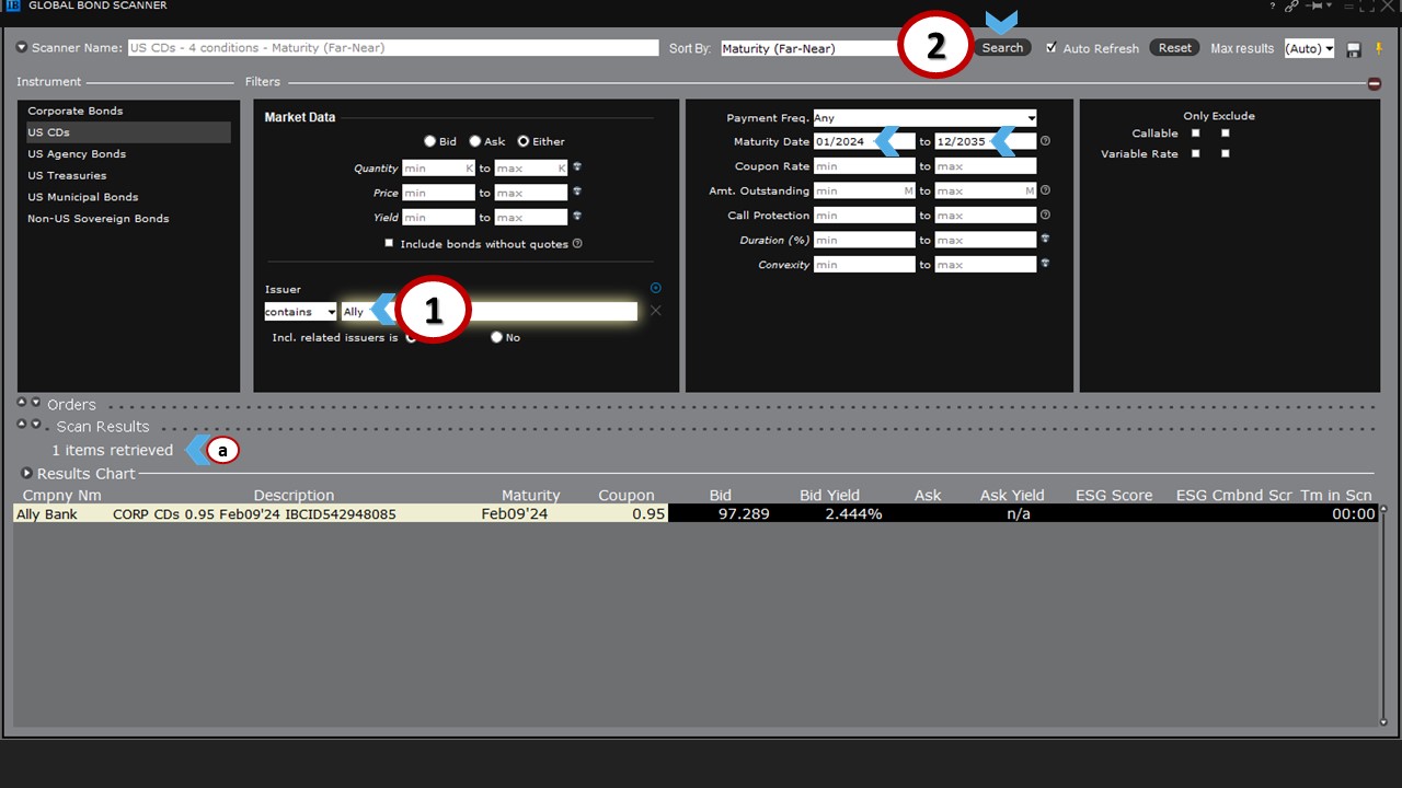 When done, (3) conduct the search, and thousands of CDs will have been retrieved in the scan results. You can see the various companies that issue the instrument, and, using the (4) Sort By menu or clicking on a column header, you can resort the results by highest or lowest yield.