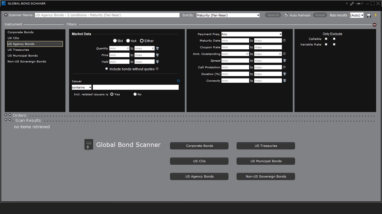 The filtering capabilities for fixed-income products (e.g., U.S. municipal bonds, U.S. Treasuries, U.S. corporate bonds) in the Advanced Market Scanner are identical to those in the Global Bond Scanner; and configuring the Advanced Market Scanner, for example, by inserting columns such as CUSIP and Issue Date, will also automatically apply to the Global Bond Scanner (i.e., configuration of the two scanners occurs simultaneously. For instance, when a column is added/removed in one scanner, it will also be automatically added/removed in the other.)