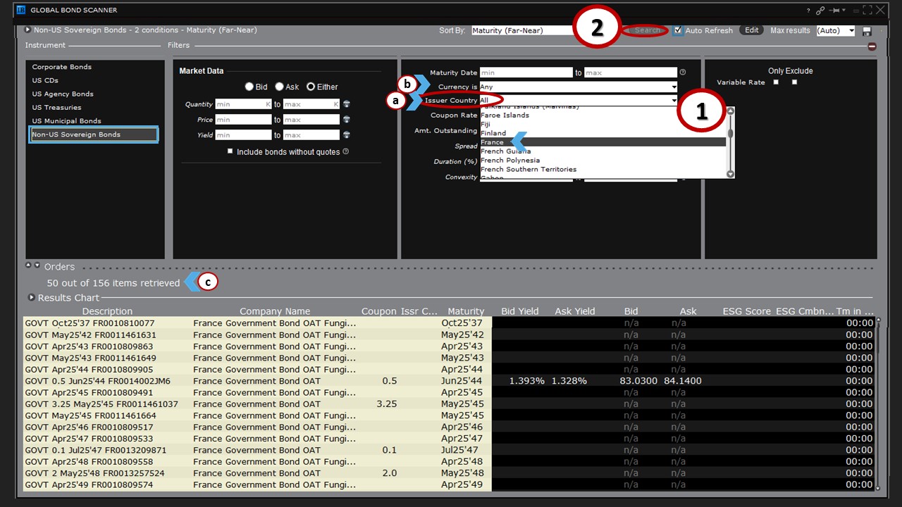 Among the available filters and input selections that may be used to help home-in on your search are the listings for (a) Issuer Country and (b) Currency. For example, (1) selecting France as the Issuer country and (2) clicking on the Search button will yield a healthy (c) list of results.