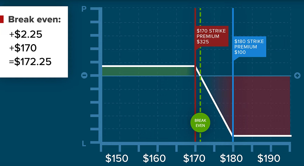The initial credit received on the trade raises the breakeven point on the transaction by the amount of the 2.25 credit. Add that to the lower strike price of 170 to calculate a breakeven price of $172.25.